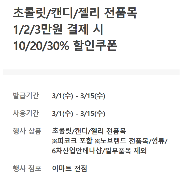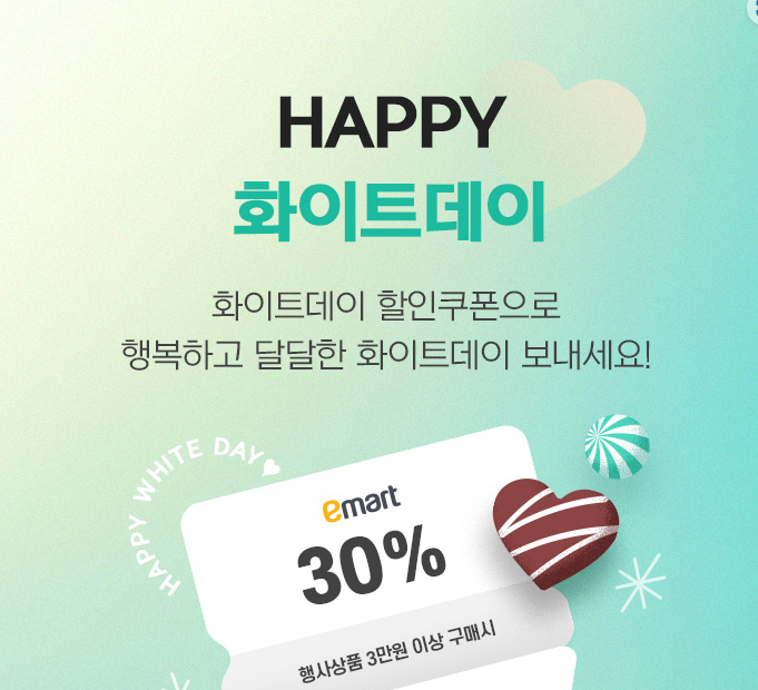 화이트데이 할인쿠폰으로 행복하고 달달한 화이트를 보내는 화이트데이 할인쿠폰 이벤트가 실시됩니다. 3월 1일부터 3월 15일까지 발급이 가능하며 행사 상품으로는 초콜릿, 캔디, 젤리 전품목입니다.