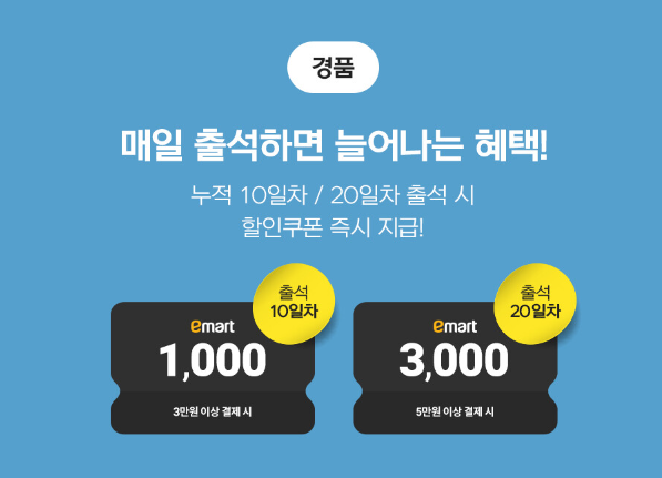 매일 출석하면 늘어나는 혜택을 주는 출석체크 이벤트가 실시됩니다. 누적 10일차, 누적 20일차 출석시 할인쿠폰이 즉시 지급됩니다. 또한 추첨을 통해서 이마트기프트콘, 스타벅스 모바일 쿠폰 등을 지급합니다.
