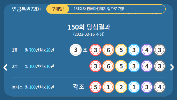 이번주 150회 연금복권 720 1등 당첨번호는 3조 365343입니다 유독 숫자 3이 많이 포함되어 있습니다 보너스 당첨번호는 512134입니다.