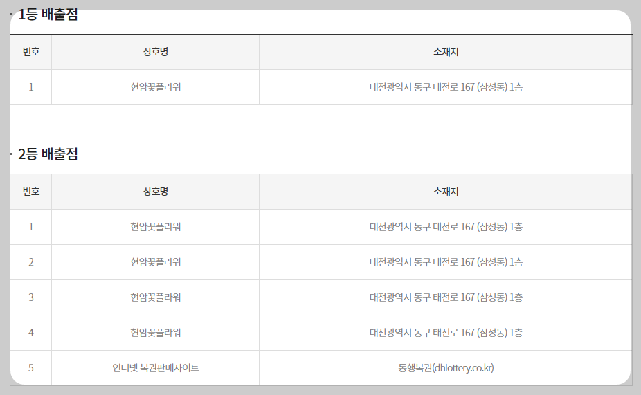제 151회 연금복권 당첨 배출지역은 대전지역과 인터넷 복권사이트입니다. 1등 및 2등 오프라인 연금복권 720 당첨 배출지역은 대전광역시 동구 태전로 삼성동에 위치한 현암꽃플라워 복권 판매점입니다. 이번 151회 연금복권 720 당첨자는 2등이 인터넷 복권사이트 동행복권 홈페이지에서 1명이 당첨이 되었습니다.